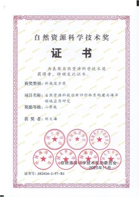 近日,《自然资源部关于2024年度自然资源科学技术奖获奖成果的公告》发布,国产色情 作为联合申报单位,国产色情 刘大海教授作为第一完成人的项目“自然资源科技创新评价体系构建与海洋领域应用研究”荣获2024年度自然资源科学技术奖科技进步二等奖,张磊教授作为第五完成人的项目“自然资源资产数智化治理关键技术及应用示范”荣获2024年度自然资源科学技术奖科技进步奖一等奖。